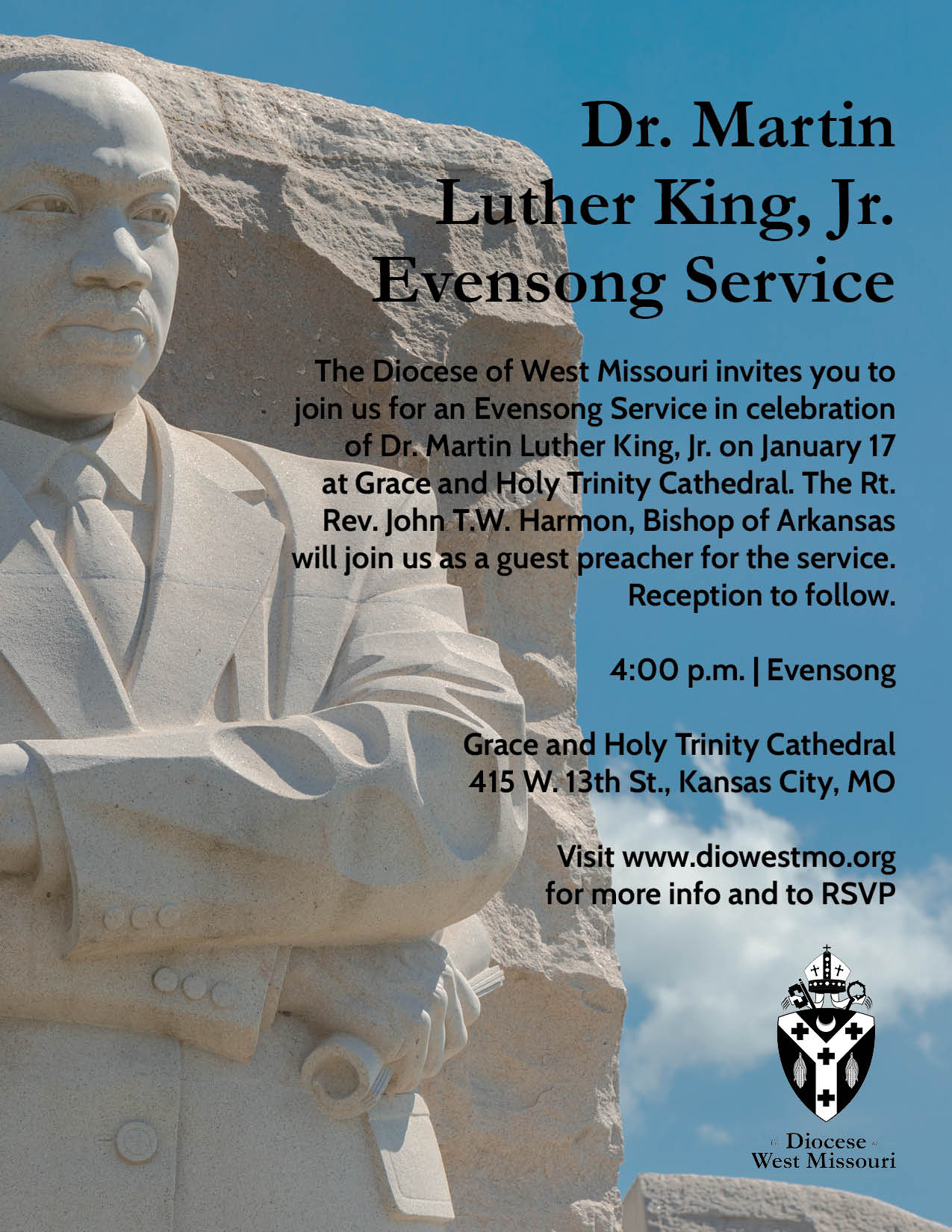 The Diocese of West Missouri invites you to join us for an Evensong Service in celebration of Dr. Martin Luther King, Jr. on January 17 at Grace and Holy Trinity Cathedral at 4 p.m. The Rt. Rev. John T.W. Harmon, Bishop of Arkansas, will join us as a guest preacher for the service. A reception will follow.